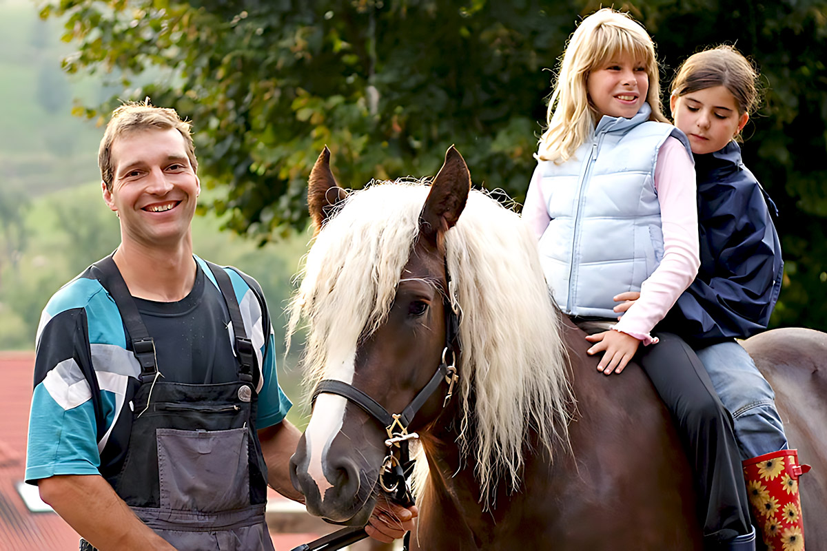 Unsere Schwarzwälder Kaltblüter sind kräftige, gutmütige Pferde – keine typischen Reitpferde, daher sind wir kein Reiterhof. Reiten ist nur gelegentlich möglich, aber in der Nähe gibt es viele Reitangebote.